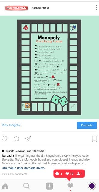 The games nor the drinking stop when you leave Barcadia. On Instagram, we will post drinking game instructions for popular board games, video games, and major sporting events.