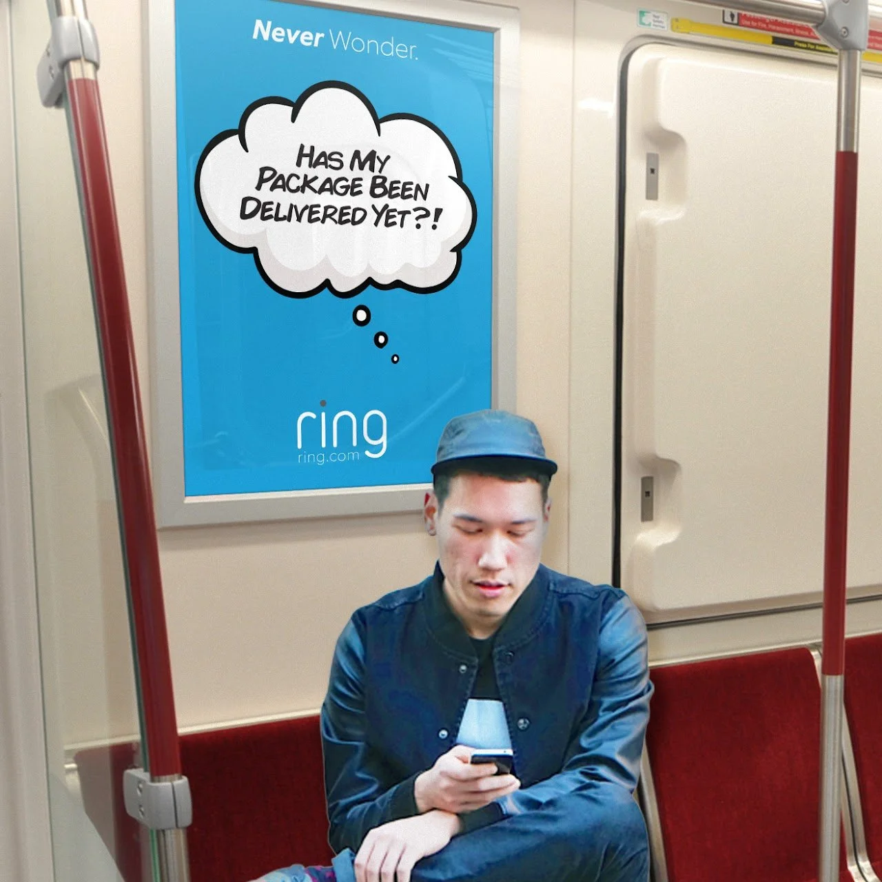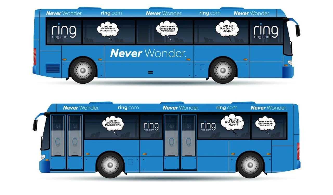 Commuting to work is a time where worrisome thoughts race through people’s heads. Those thoughts are put to rest with Ring. We will create bus wraps so when the person is sitting on the bus, on the outside it looks like they have a thought that may pop into one's brain while commuting. We will do a similar execution with subway ads.